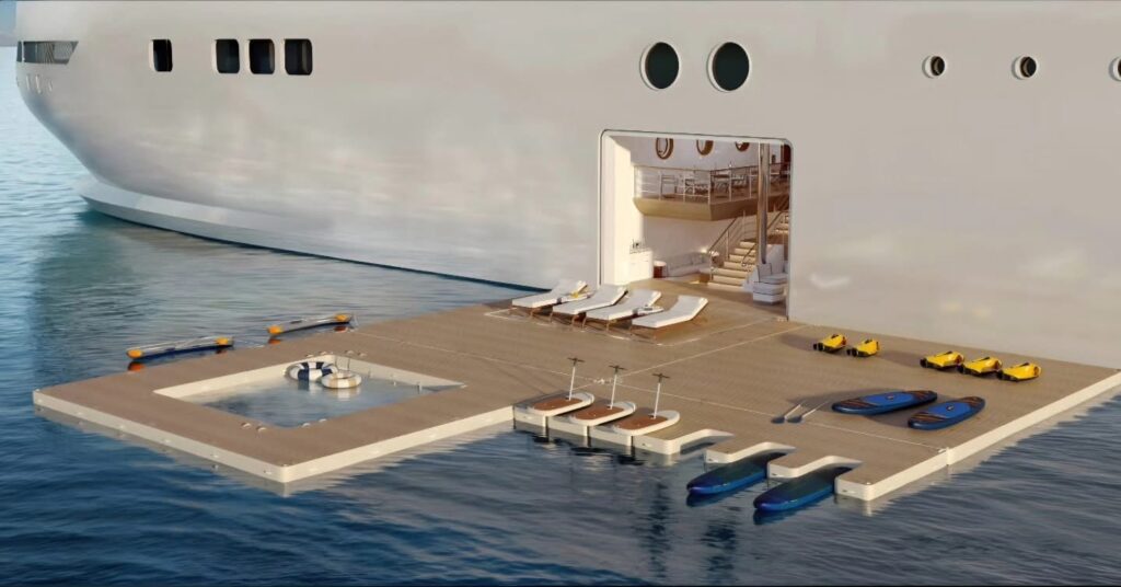 Diseñado con una visión revolucionaria en arquitectura naval el yate integra una marina transversal que se extiende de babor a estribor equipada con plataformas retráctiles áreas lounge interiores y exteriores un bar náutico de alta gama y una plataforma flotante con piscina generando así más de 675 metros cuadrados dedicados al bienestar la exploración y la aventura en destinos cuidadosamente seleccionados del Mediterráneo y el Caribe.
