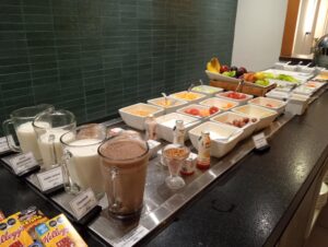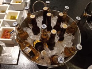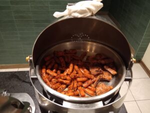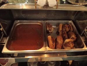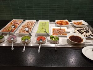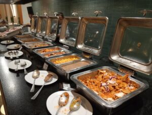 —Es en domingo, tenemos un brunch después de las diez de la mañana, guisados de camarón, camarones a la salsa cremosa de chipotle, pulpos a la gallega, pescado a la veracruzana. Carnitas, guisado de lengua de res, cochinita pibil. Huevo en salsa roja. Chilaquiles rojos y verdes. Frijoles guisados. En la minuta tenemos huevos al gusto, y también podemos ofrecerles un corte de carne, ya sea asado, de ribeye, filete de res. Tortas ahogadas, pizza. Carne en su jugo, pozole. Del lado de la fría, ceviche, aguachile rojo, verde cremoso. Sushi, sashimi de atún. Ensalada de mariscos con salsas negras. Tres variedades de jugos. Se pueden hacer al momento los jugos naturales con la fruta que tenemos. Variedades de leche, choco milk. Vino espumoso para prepararse mimosas. Cerveza. Fruta, yogurt, gelatinas. Panecito recién hecho, rico café, etcétera.