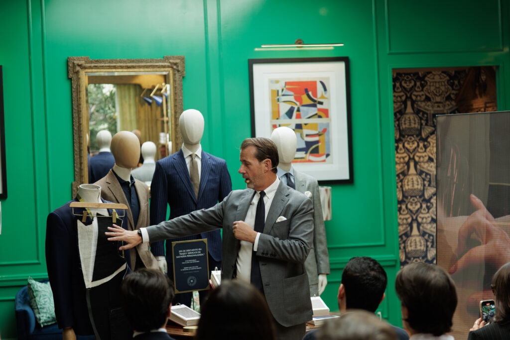 Frente a invitados, Simpkins habló sobre la esencia de Hackett London, una casa creada para preservar la elegancia británica y reinterpretarla para el hombre moderno. A través de ejemplos, maniquíes y muestras de tela, explicó cómo la línea Savile Row representa el punto más alto de la sastrería inglesa: trajes con alma artesanal, materiales premium y una construcción pensada para acompañar cada movimiento del hombre contemporáneo.