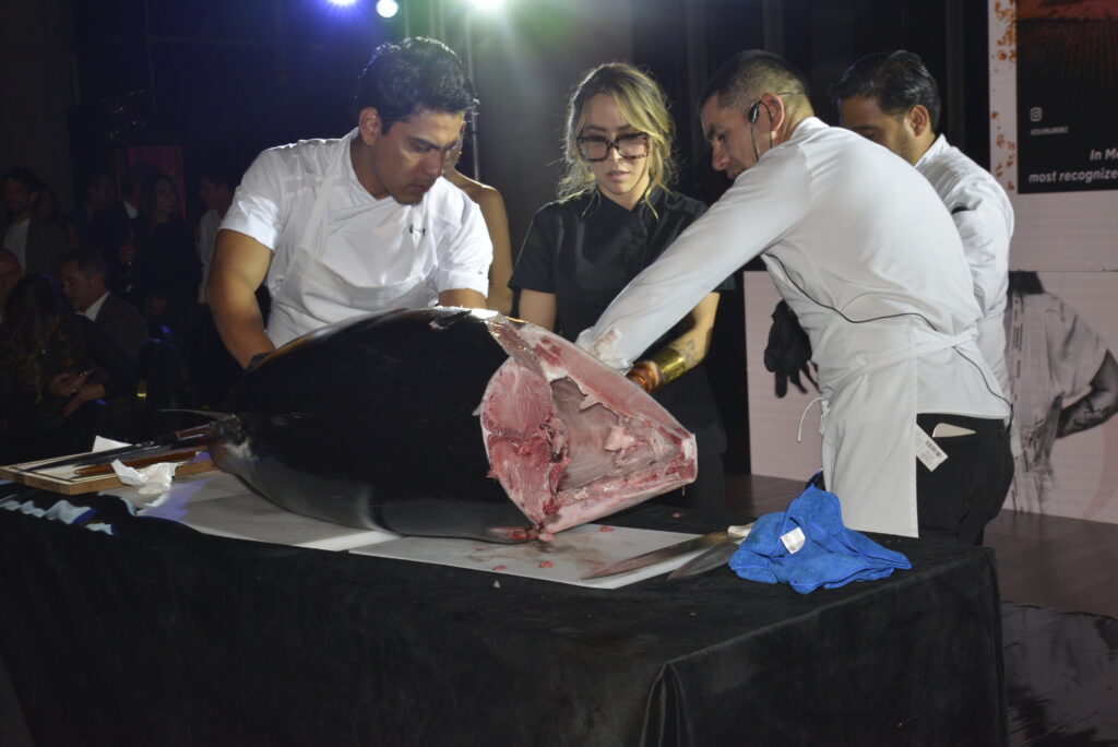 La velada comenzó con un cóctel de bienvenida que dio paso al momento central de la noche: el ronqueo de atún. El chef Hugo Jiménez fue el encargado de ejecutar el corte del Atún Aleta Azul del Pacífico, Thunnus orientalis, una de las especies más valoradas en la gastronomía internacional. El ejemplar, proveniente de Baja California, destacó por su calidad y frescura, atributos garantizados por Bluefiná, productor reconocido por su modelo de captura y engorda en maricultivo, así como por la trazabilidad de sus productos desde su origen en aguas del Pacífico mexicano.