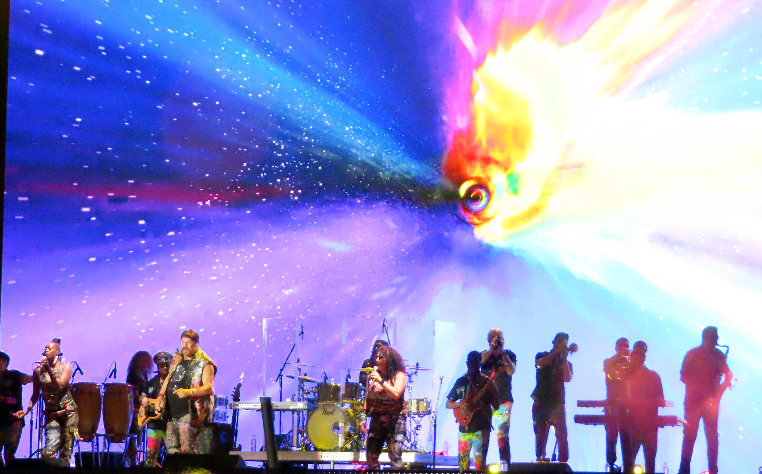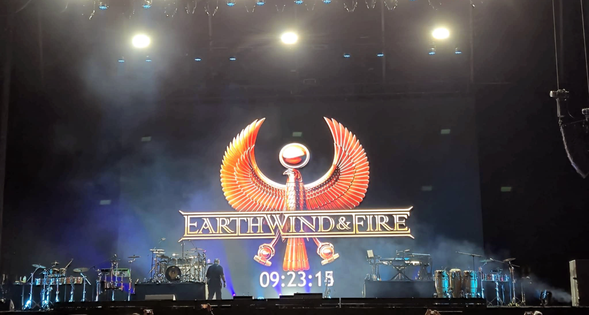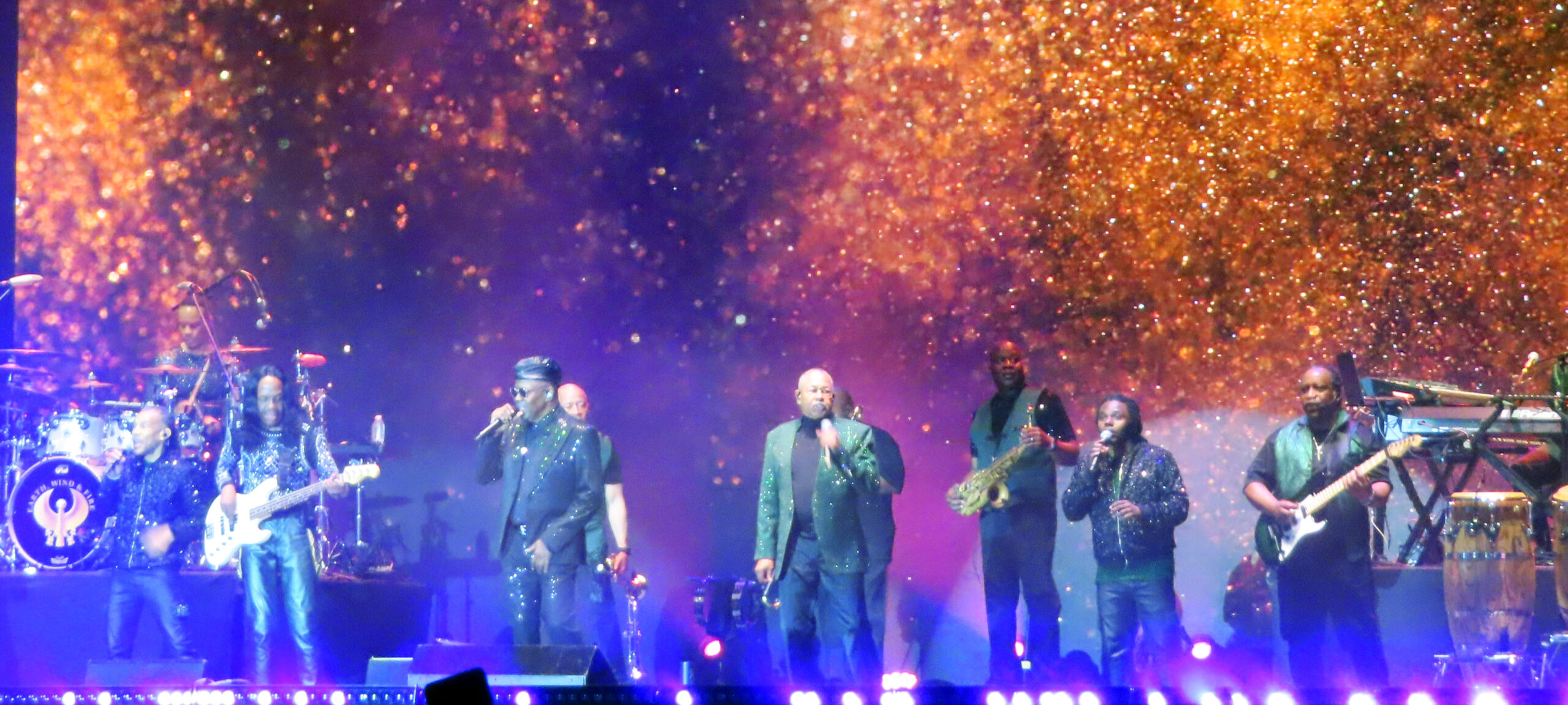 Tras unos minutos, se prendió una enorme imagen con un contador con el logo de Earth, Wind & Fire; era el momento de apreciar a los angelinos en acción. Con una breve introducción de videos de sus más grandes discos y una voz de ultratumba mencionando “Earth, Wind & Fire”, las luces se encendieron y el estadio estalló con el tema “Shining Star”. Los metales y el bajo de Verdine White fueron una cachetada a los sentidos: el bajo sonaba y vaya que sonaba. Cerca de 30 mil personas celebraban el regreso de la banda a tierras mexicanas. La gente abarrotó los pasillos para ver de cerca a los integrantes con sus pantalones brillantes, túnicas relucientes y chaquetas resplandecientes. La energía también era evidente en el escenario: mientras el vocalista Philip Bailey y los demás cantantes encabezaban el espectáculo al frente, los percusionistas y la sección de metales armaban una fiesta en la parte trasera.