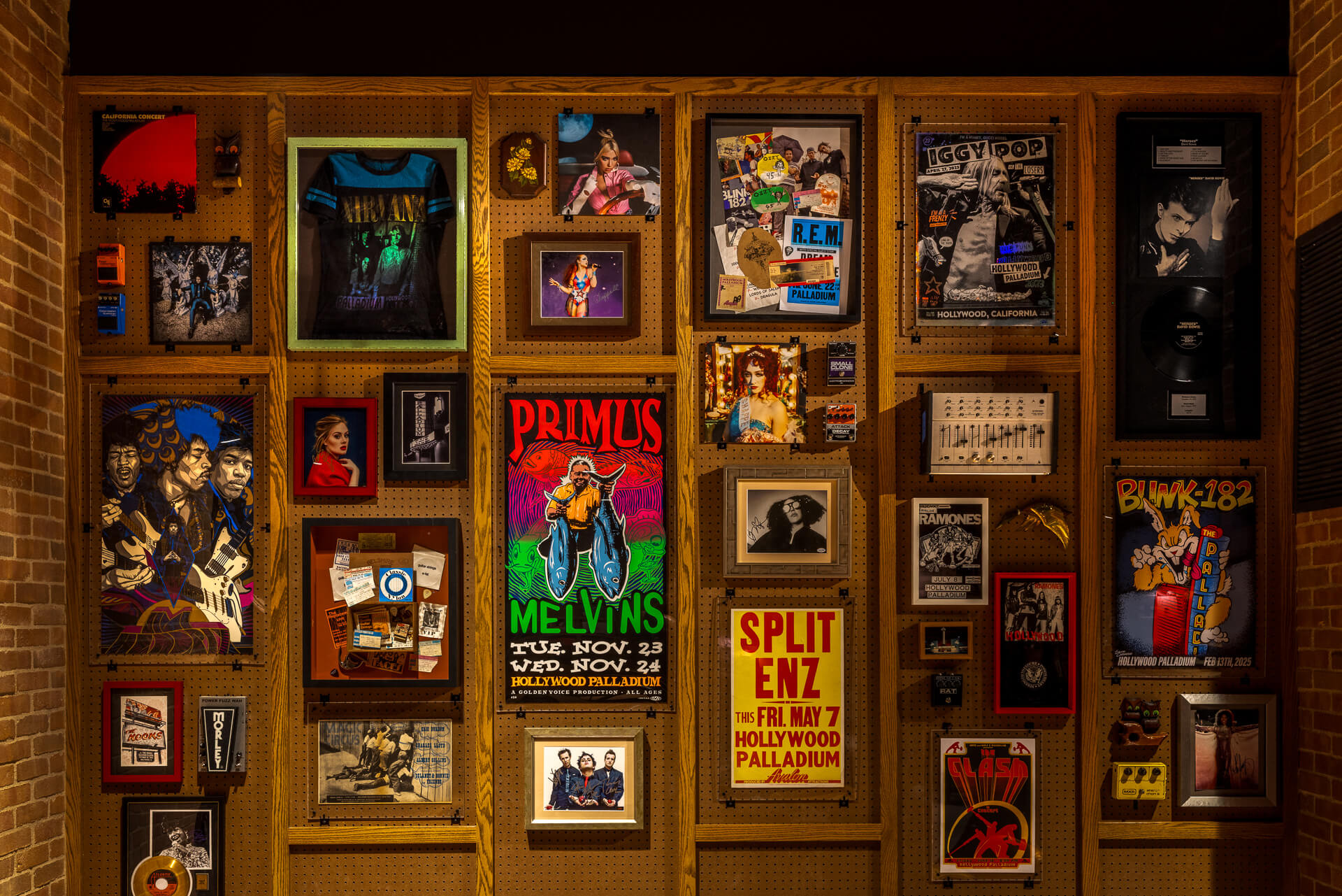 Desde el primer momento, el visitante se encuentra rodeado por décadas de historia musical. Las paredes funcionan como archivo vivo, revestidas con vinilos de artistas que han pasado por el escenario del recinto, desde Frank Sinatra hasta Green Day, pasando por nombres fundamentales como The Ramones, 2Pac y Adele. Cada elemento está dispuesto con una intención clara: recordar que la música no solo se escucha, también se habita.